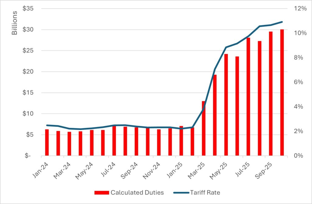 The tariff outlook has drastically changed over the past year, with the effective tariff rate skyrocketing from under 3 percent before President Trump’s inauguration to 28 percent post “Liberation Day.” It now sits at roughly 14 to 16 percent.