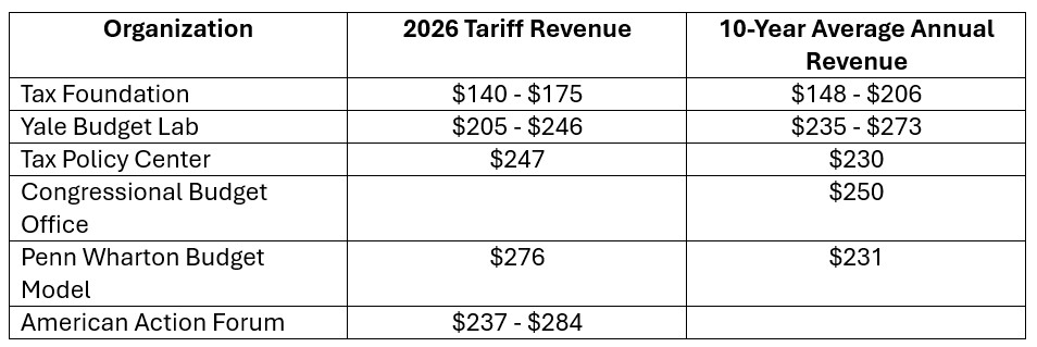 The day after “Liberation Day,” American Action Forum research put total annualized tariff costs at $366.5–391.6 billion. As of February 2026, this estimate sits around $237 billion. Factoring in other tariffs and proposals, this cost estimate approaches $284 billion annually, which is in line with the Bipartisan Policy Center’s current tariff tracker. Other tariff revenue estimates are included below in Figure 2.