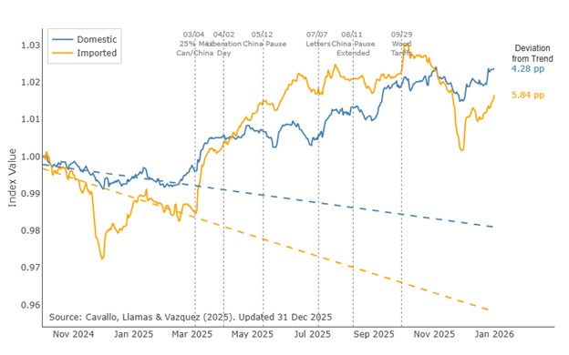 The tariff tax hike has had noticeable economic effects. First, tariffs reversed the downward trend in inflation for many goods categories, with the consumer price index remaining well above the 2-percent target. In fact, year-over-year inflation had declined from 3–2.3 percent between January and April last year but has since risen to 2.7 percent as of December. Additionally, four major retailers’ inflation trends were upended in the aftermath of tariff implementation as tracked by the Pricing Lab at Harvard in Figure 3. As a result, consumer spending on categories directly impacted by tariffs either stabilized or fell.