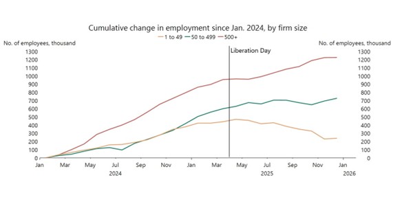 Finally, there are signs that additional tariff costs passed onto U.S. businesses have resulted in a weaker labor market, especially for small businesses. Since “Liberation Day,” U.S. employment growth among small businesses has underperformed large businesses (Figure 4). Employment in firms with 1-19 employees fell by 62,000 while employment in firms with 20-49 employees fell by 122,000 throughout 2025, potentially as a result of cost-cutting measures. There are numerous reasons why small businesses are at a disadvantage in dealing with higher tariffs, one being they tend to have far more concentrated supply chains. Most small businesses rely on just one supplier and import a select few products, which prevents them from easily adjusting to changing tariff policies like larger firms that import from 50 or more countries.